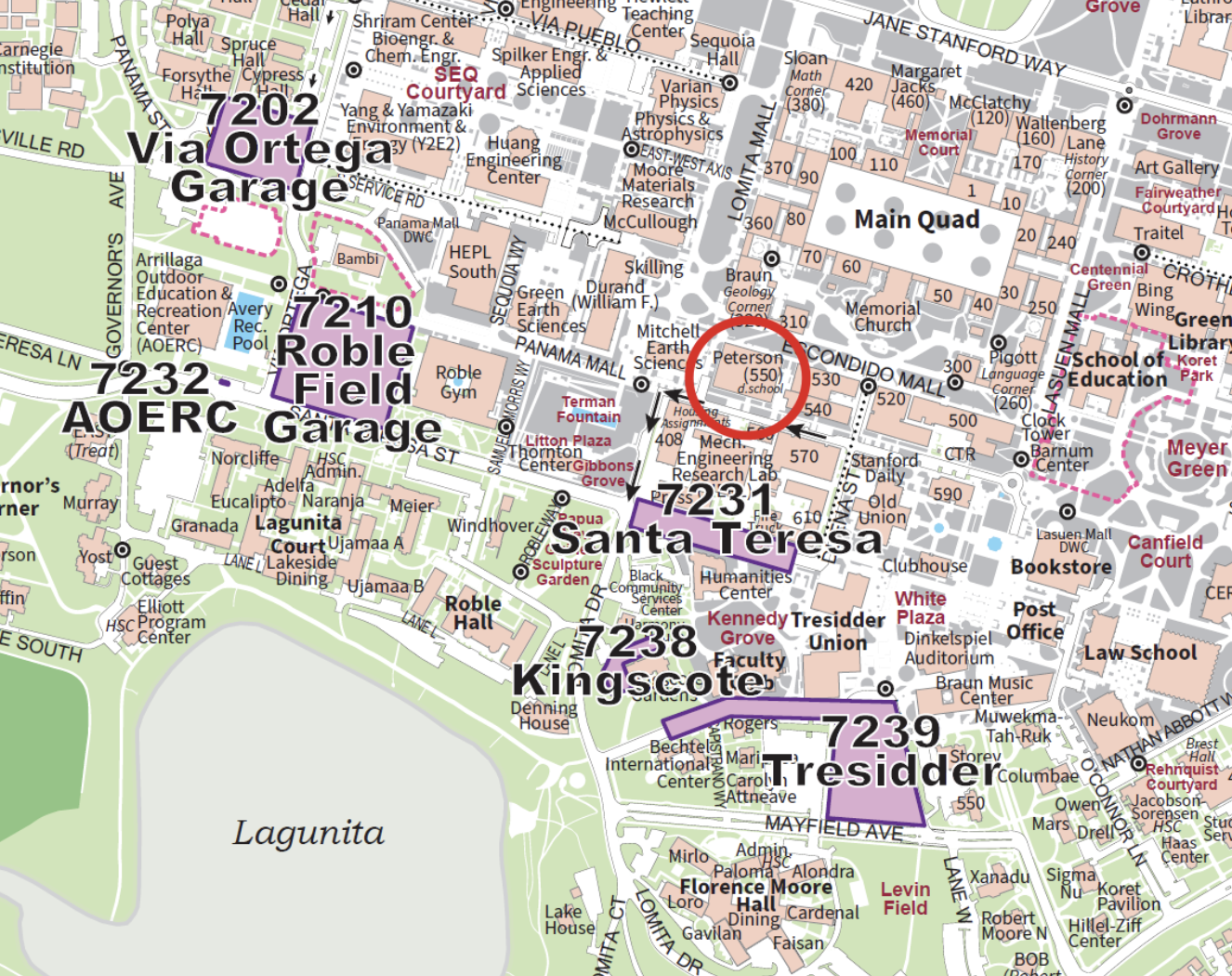 Driving: All visitor parking is managed through the ParkMobile app. Here is a map that shows the visitor parking locations around the Stanford campus. The closest parking to Life Design Studio location (Peterson Laboratory, Building 550, d.school) are zones: 7210 Roble Field Garage, 7231 Santa Teresa, 7238 Kingscote, and 7239 Tresidder. The map below shows the Life Design Studio location in a red circle.